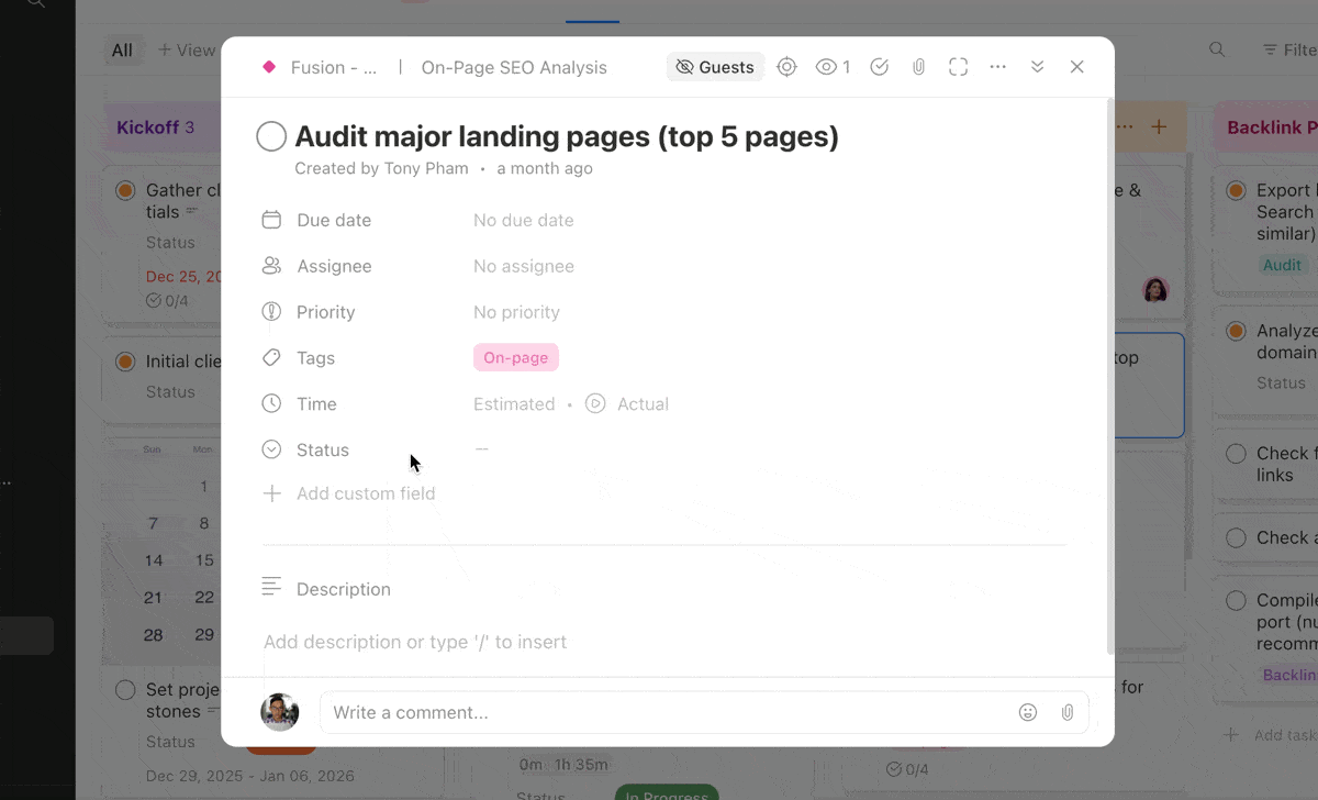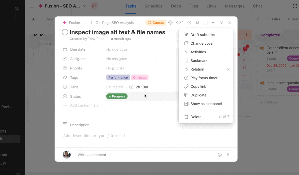The Task details panel gives you everything you need to manage and update a task in one place. From here, you can connect the task to projects, follow updates, and add related work.