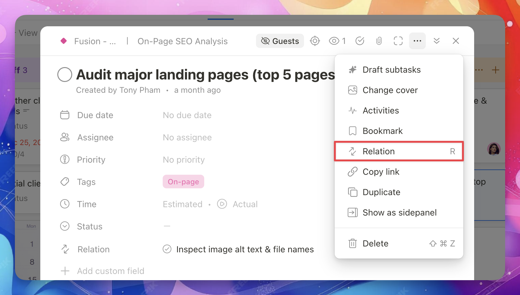 Tip: In the task details panel, press R on your keyboard to quickly open the Relation modal.