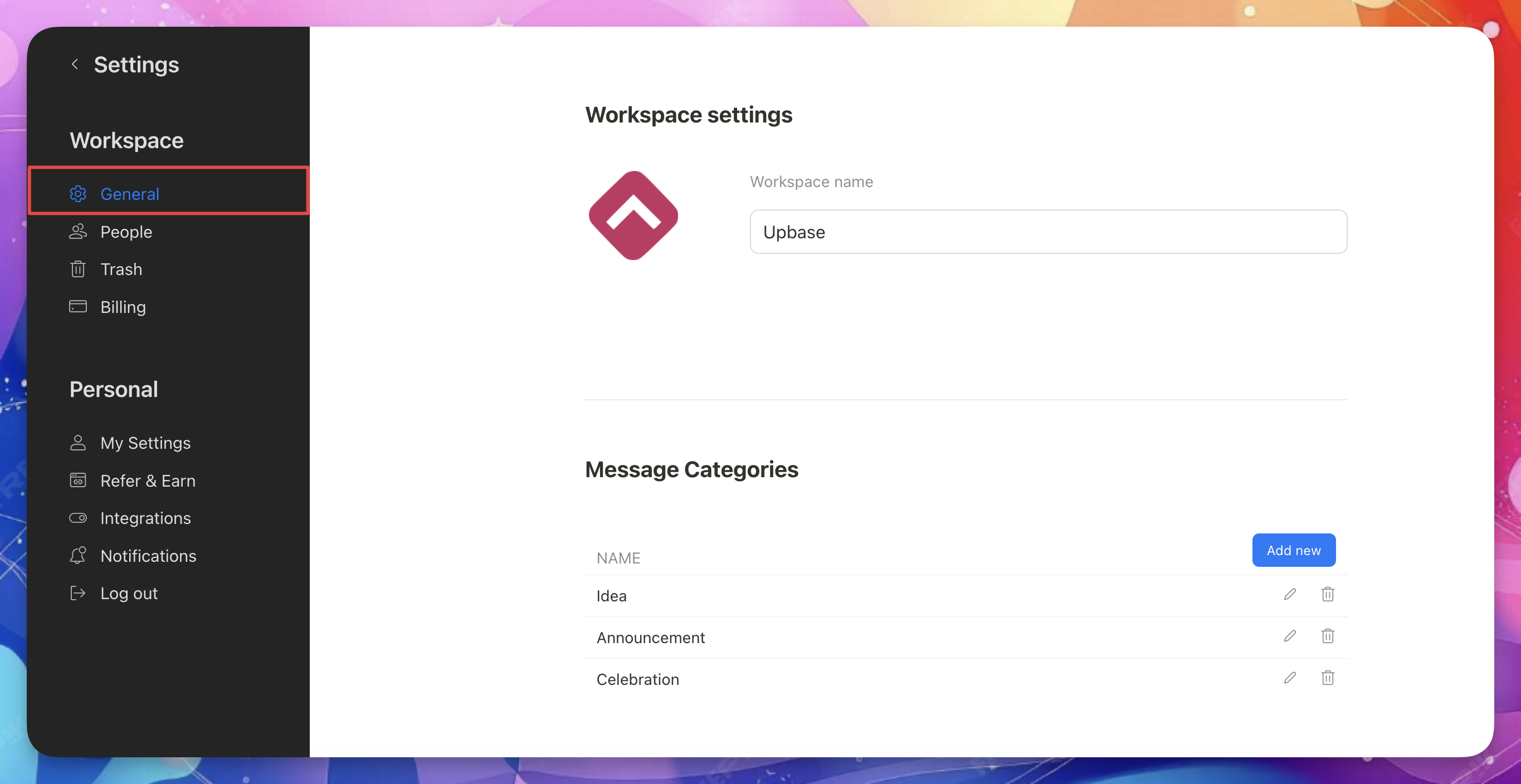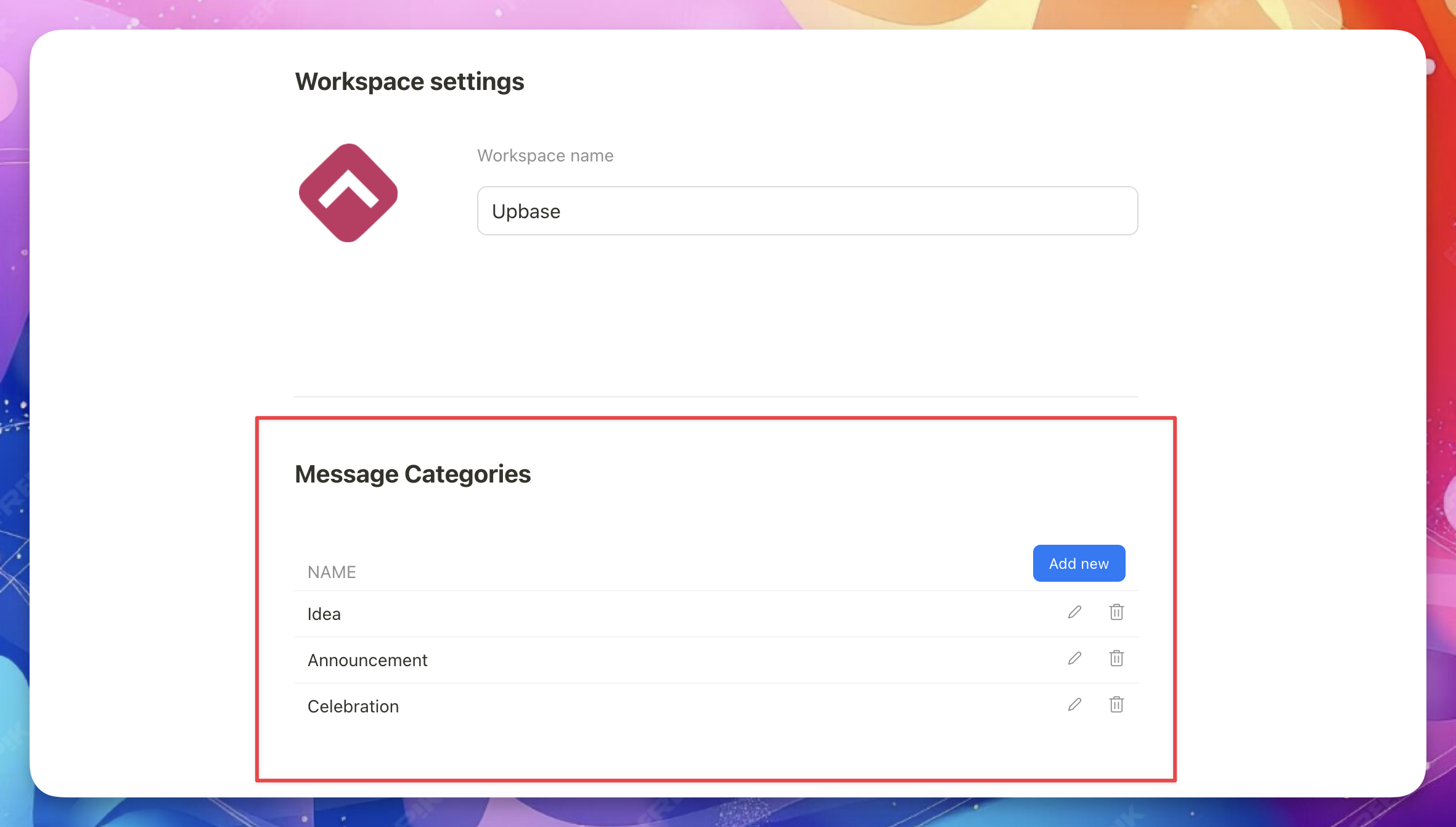 The "Message categories" section on this page allows you to create message categories for the entire workspace. These categories will be available for use in all projects.