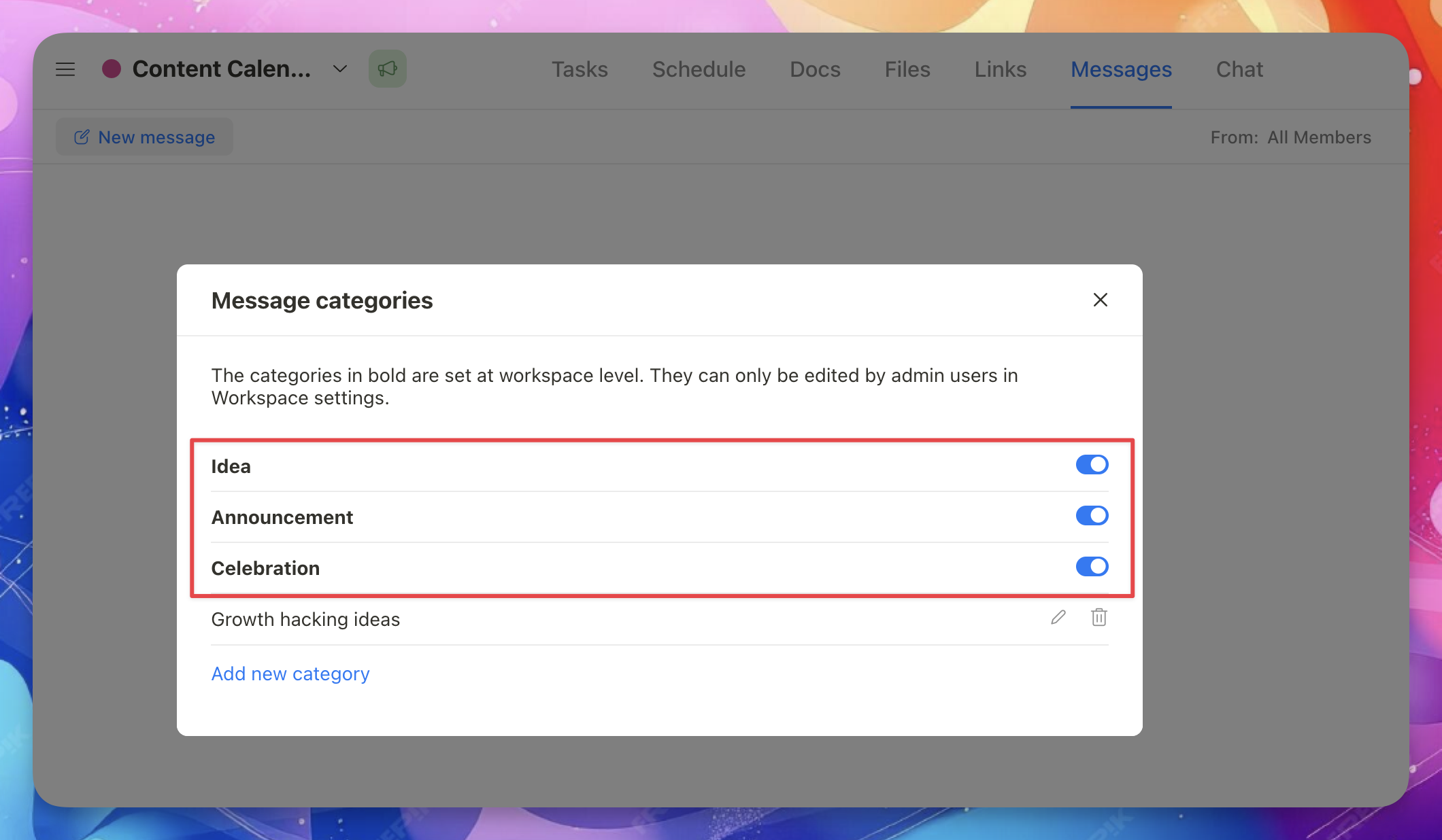 When you open the message categories popup within each project, you can see the workspace-level categories in bold.