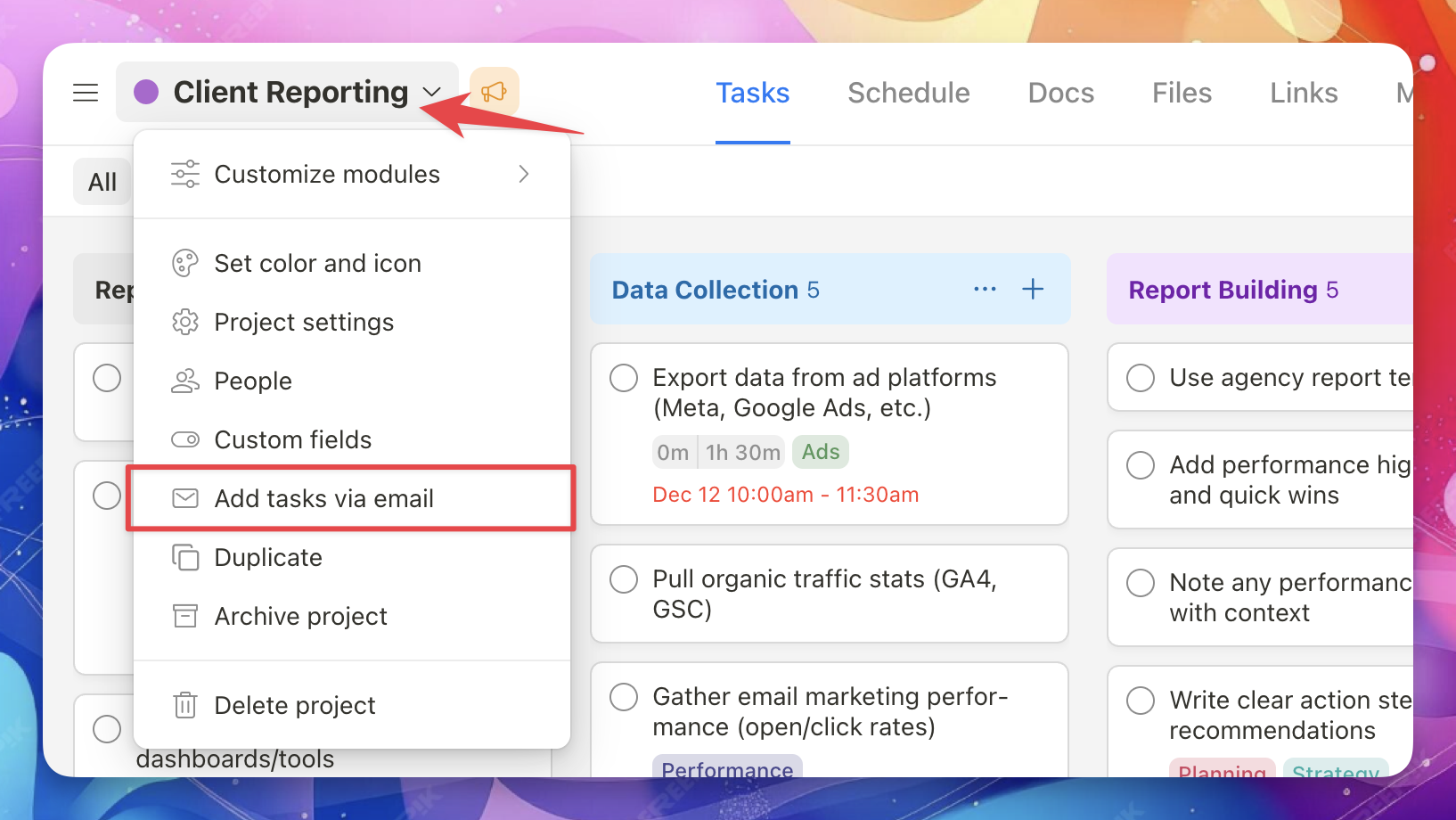 Click on the project name located in the top sidebar and choose "Add tasks via email."