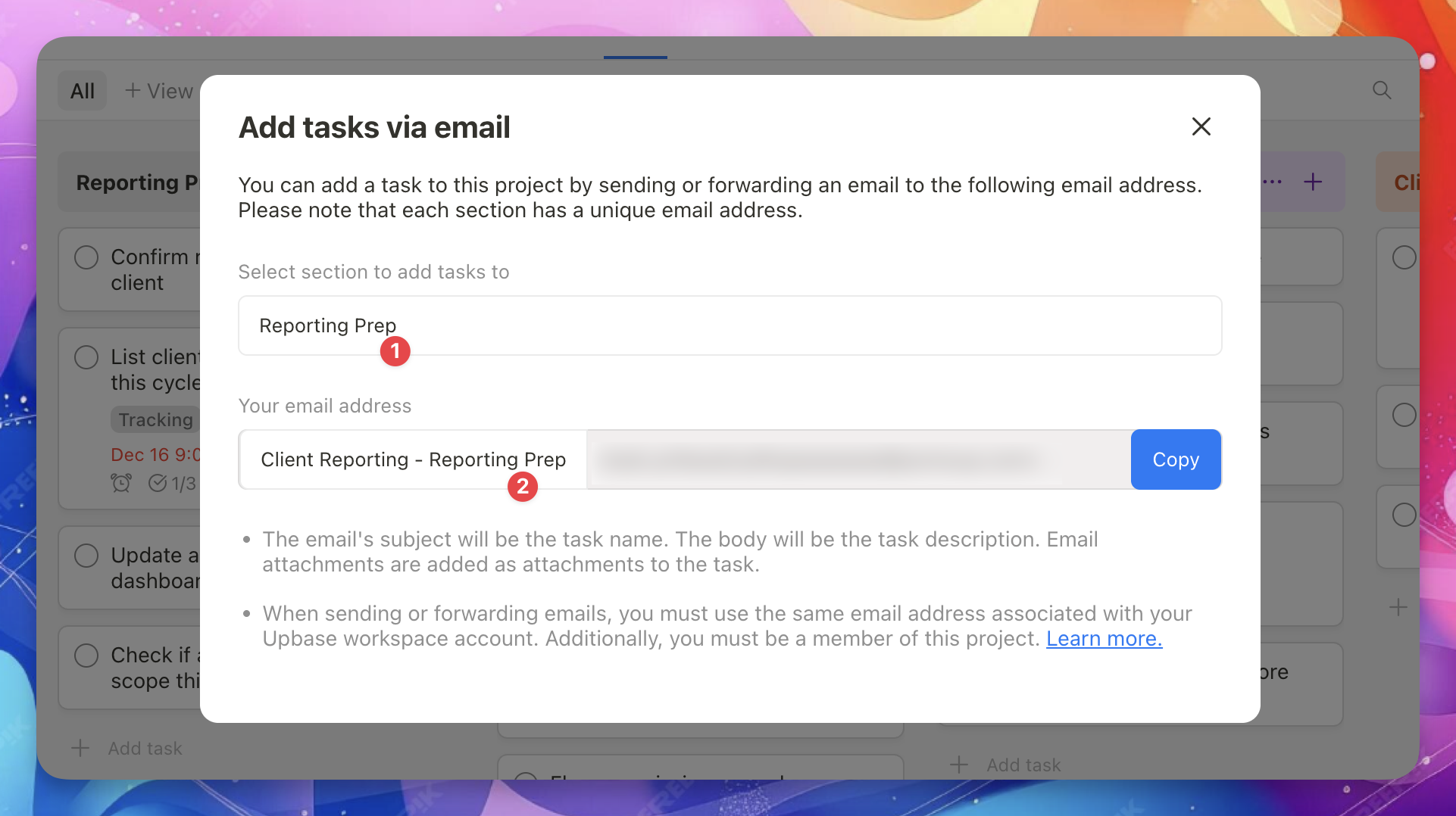 - Each section within the project has a unique email address. This means you can add tasks to different sections by sending emails to these unique addresses. When you choose a section to add tasks to from the dropdown (1), the associated email address will update accordingly.