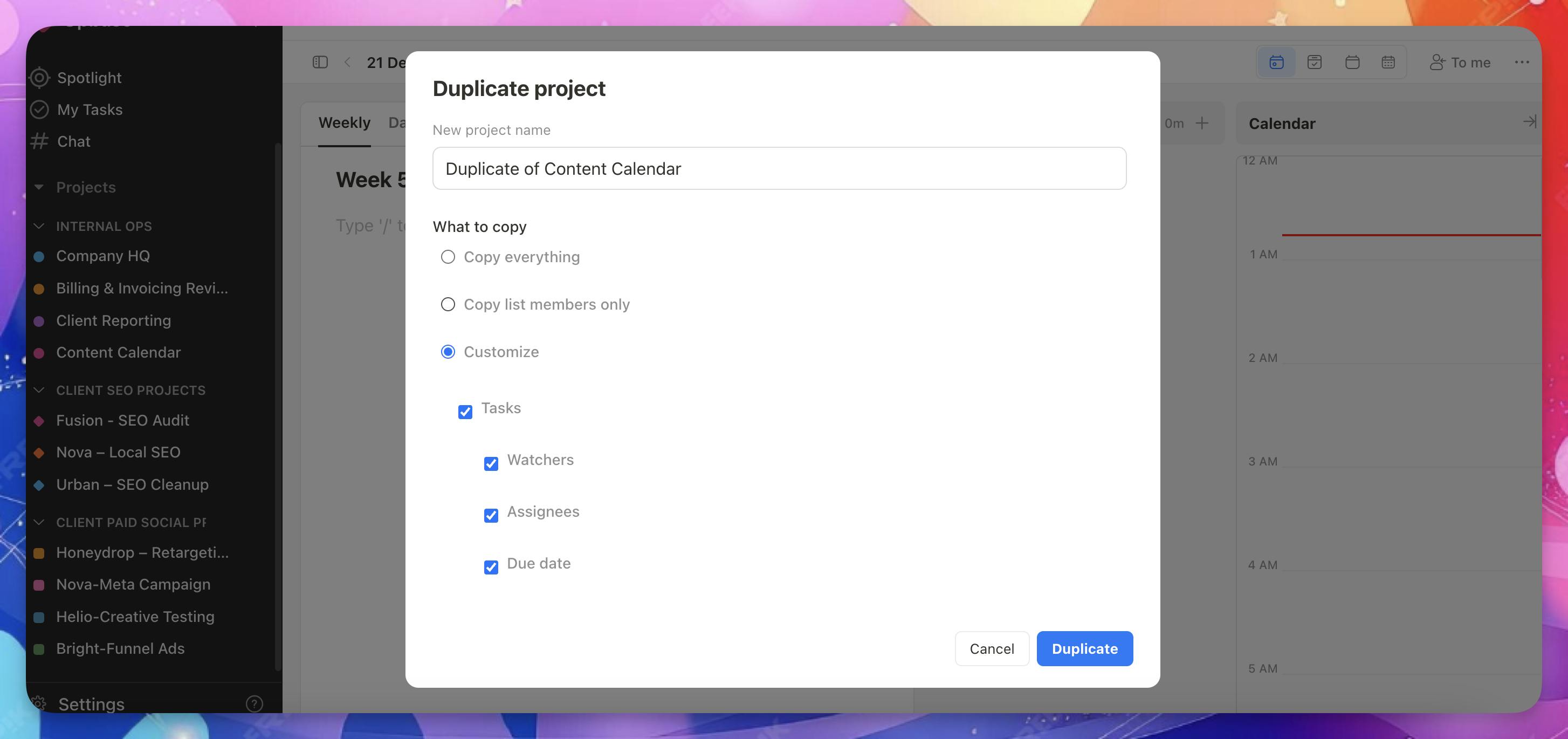 - In the duplicate project modal, choose what you want to copy to the new project.