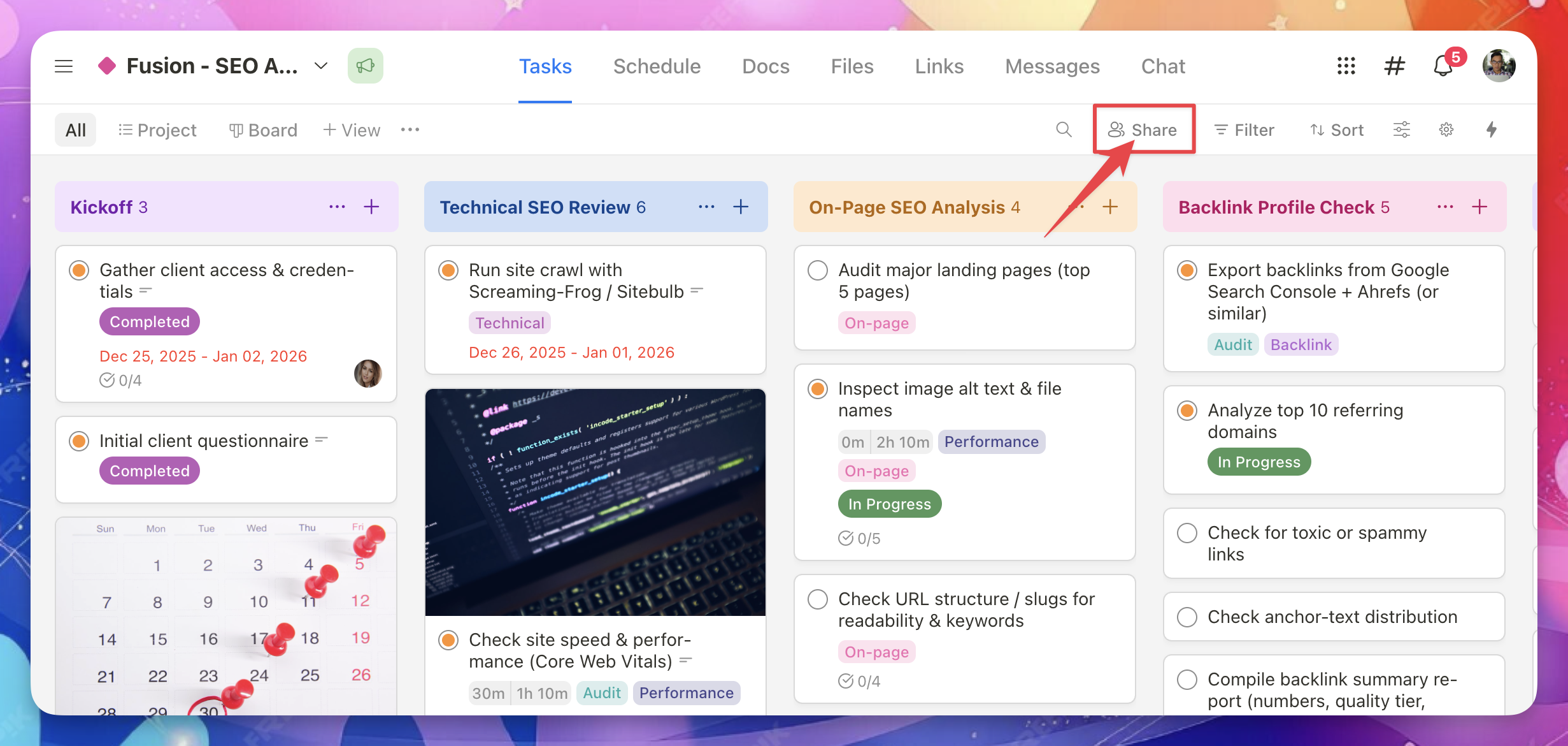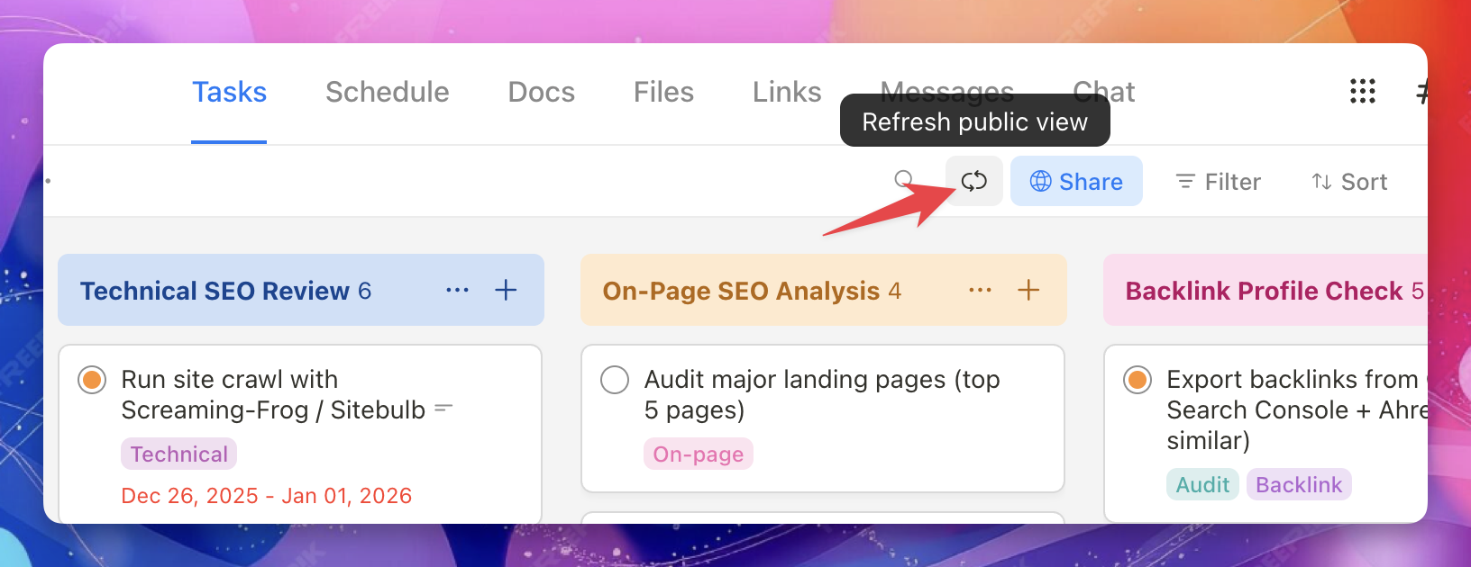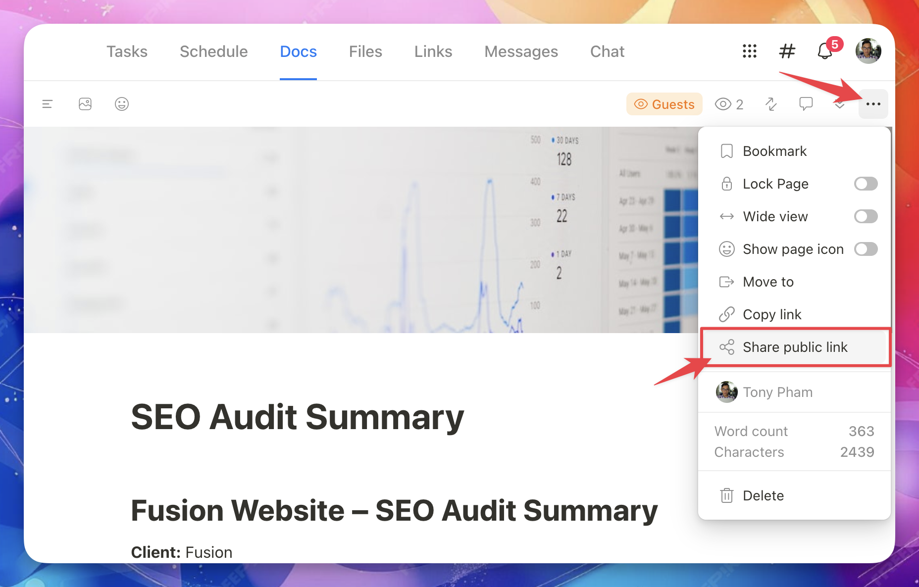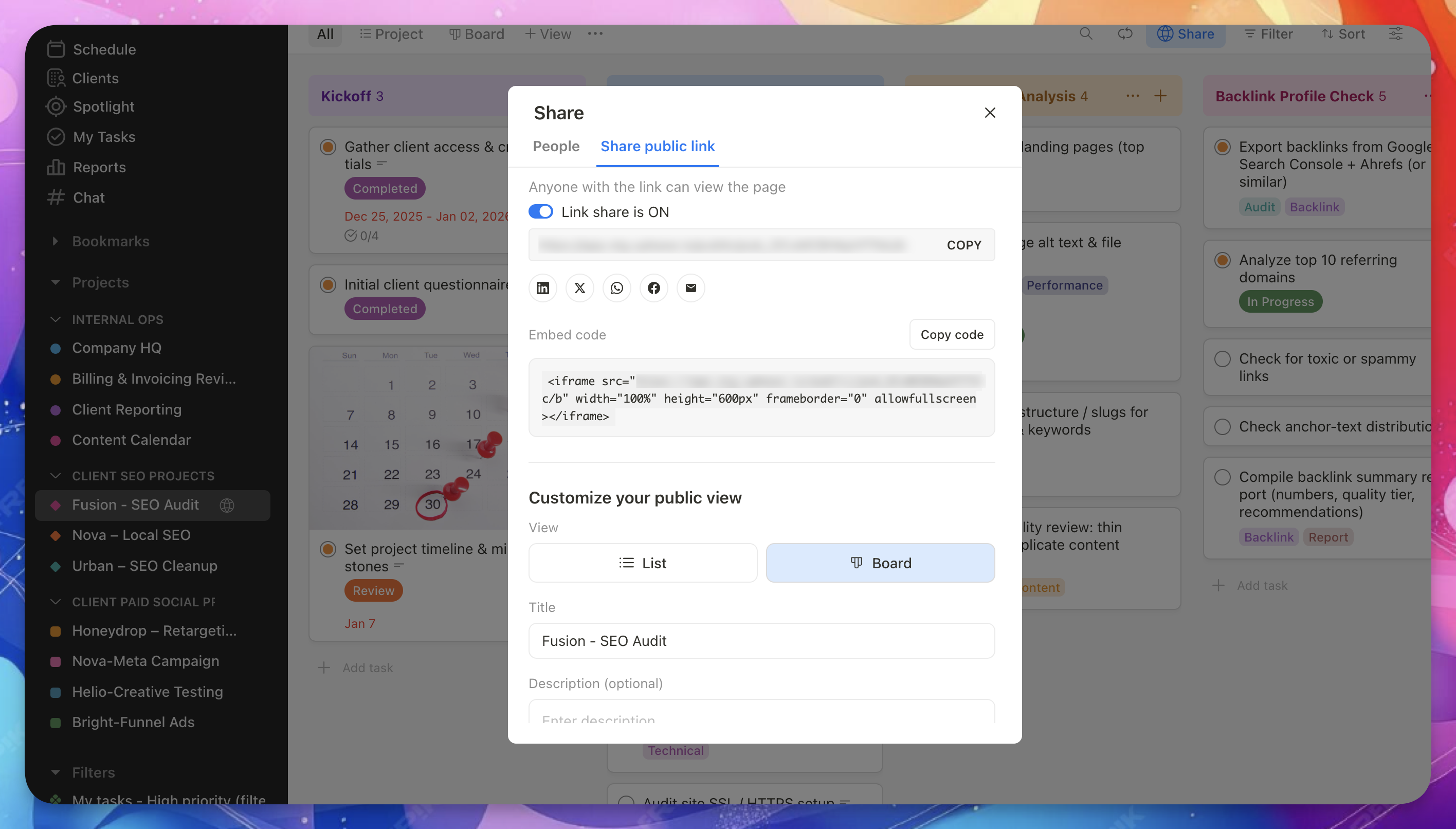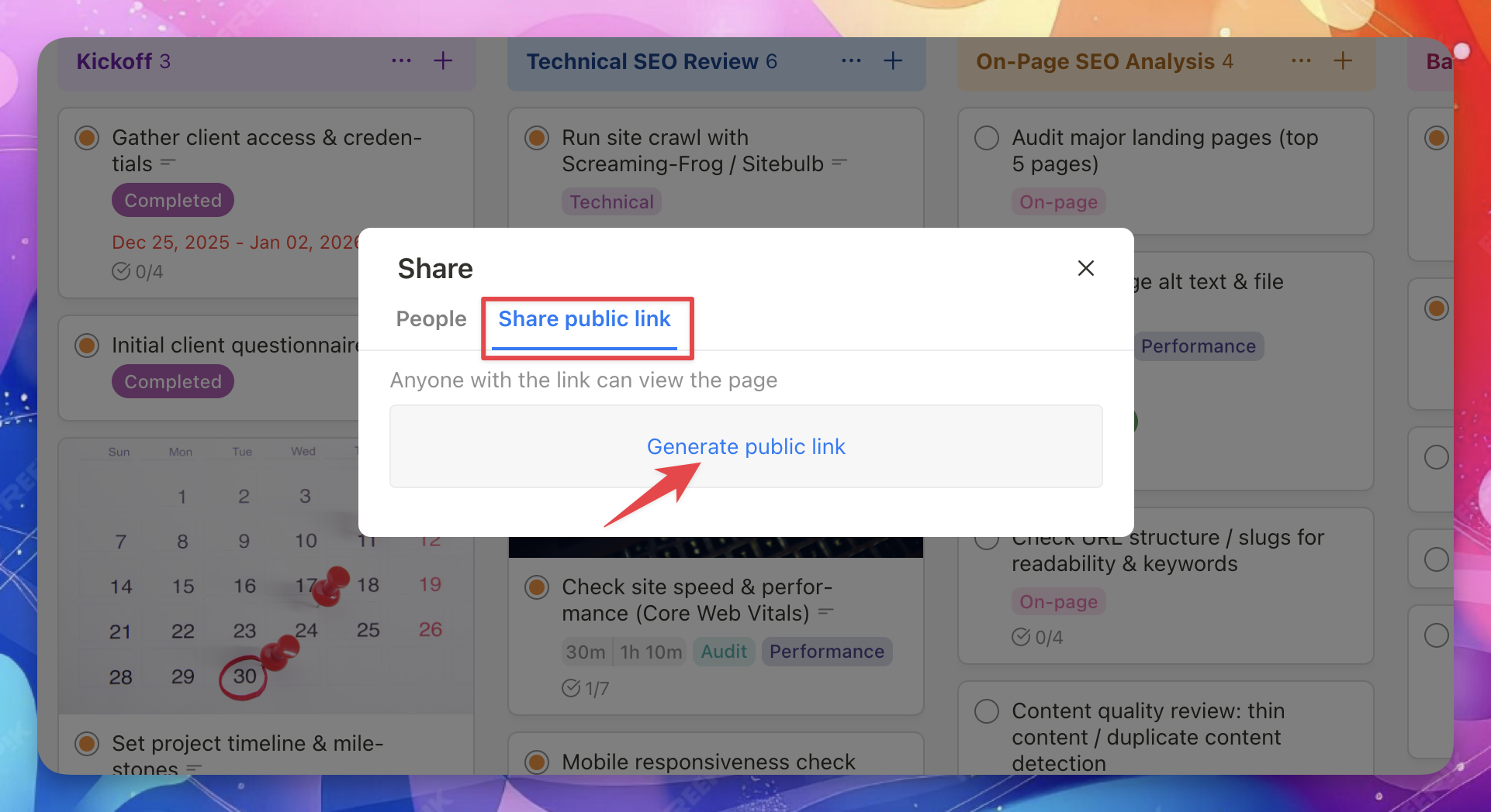 You can make a task board, doc, or file public to share work with clients or your audience—no Upbase account required to view.