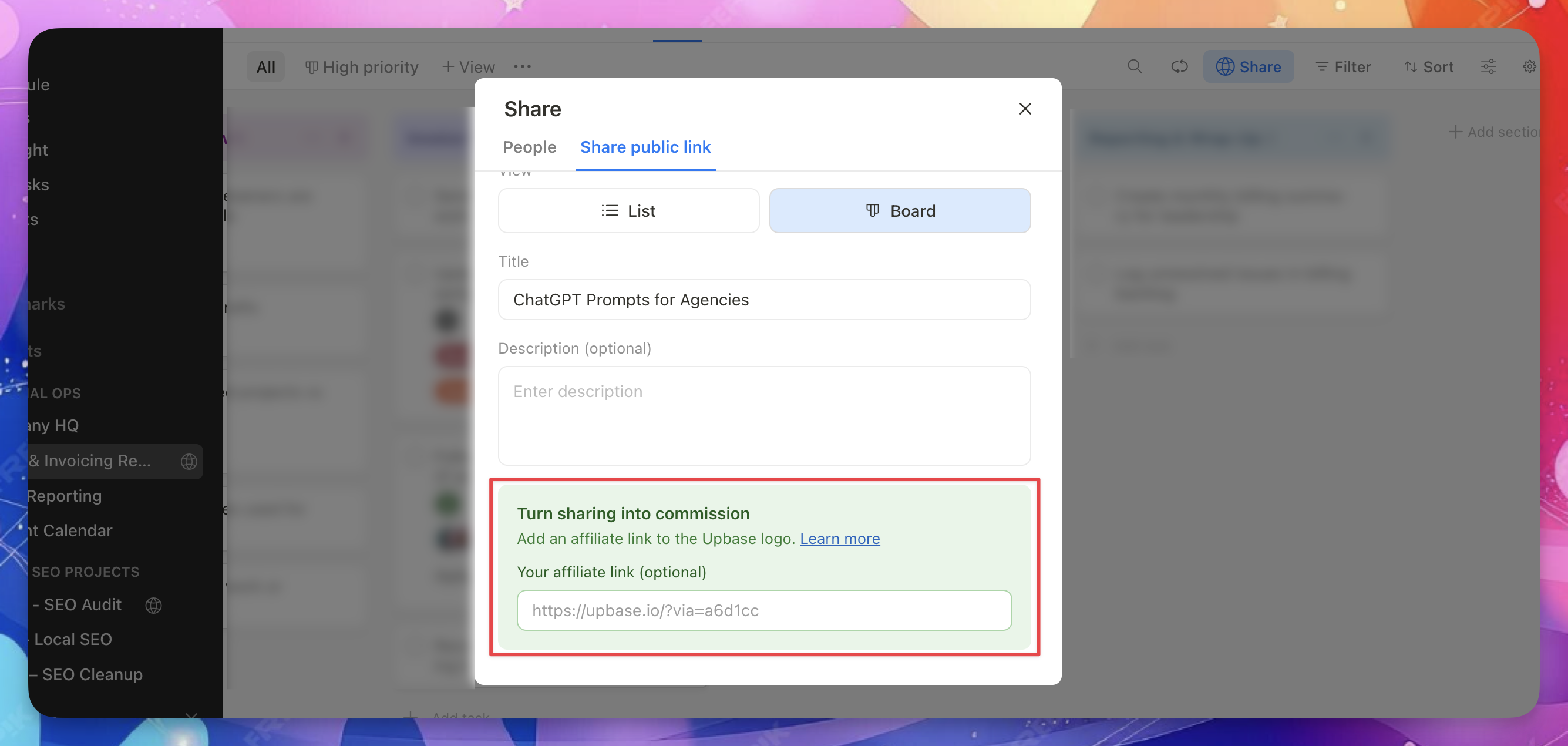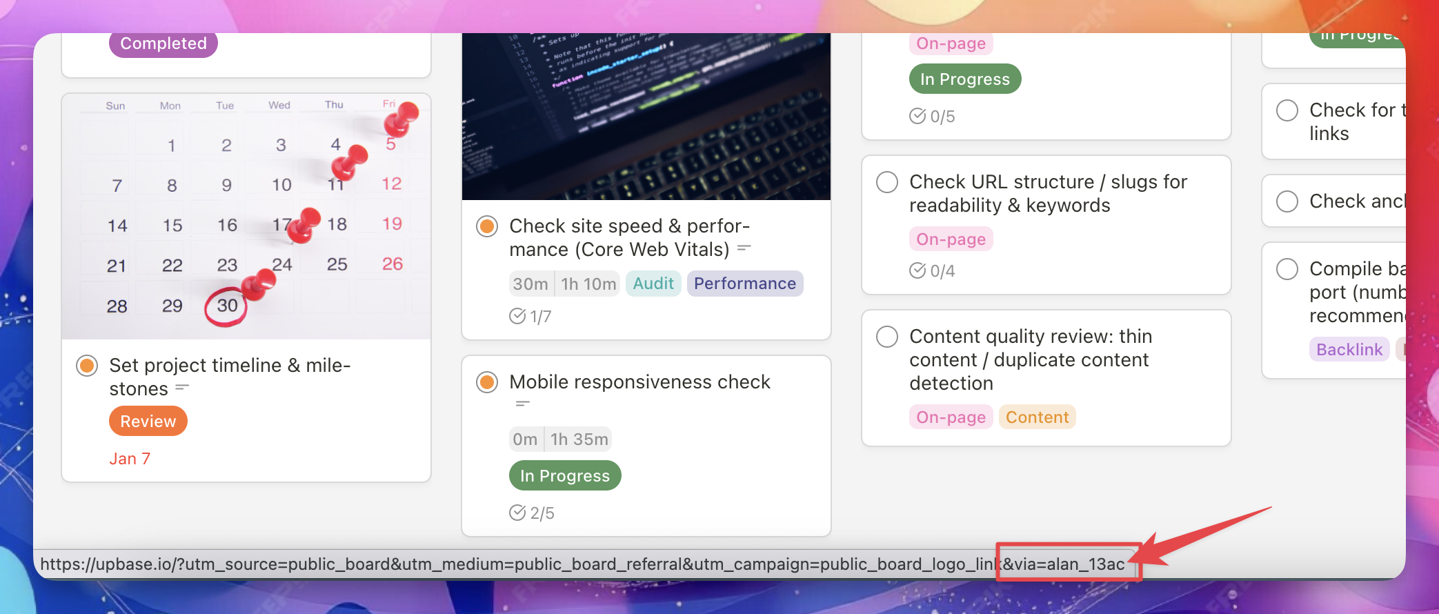 If you’re part of the Upbase affiliate program, you can add your referral link to the Upbase logo in your public board or doc.